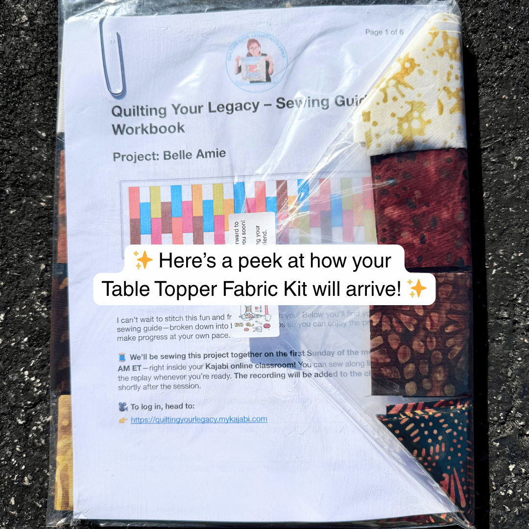 Make your project even easier with our Belle Amie Table Topper Fabric Kit, which includes all the fabrics you need plus a FREE classroom ticket to sew along with Emily and the Quilting Your Legacy community on Sunday, November 2, 2025, at 10 AM ET.
