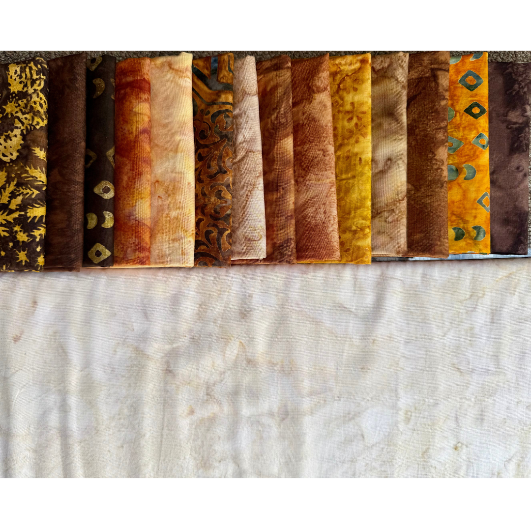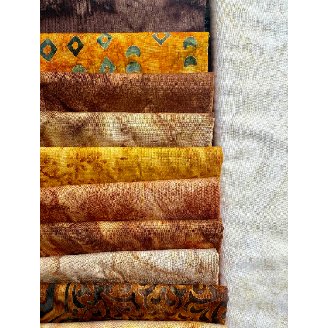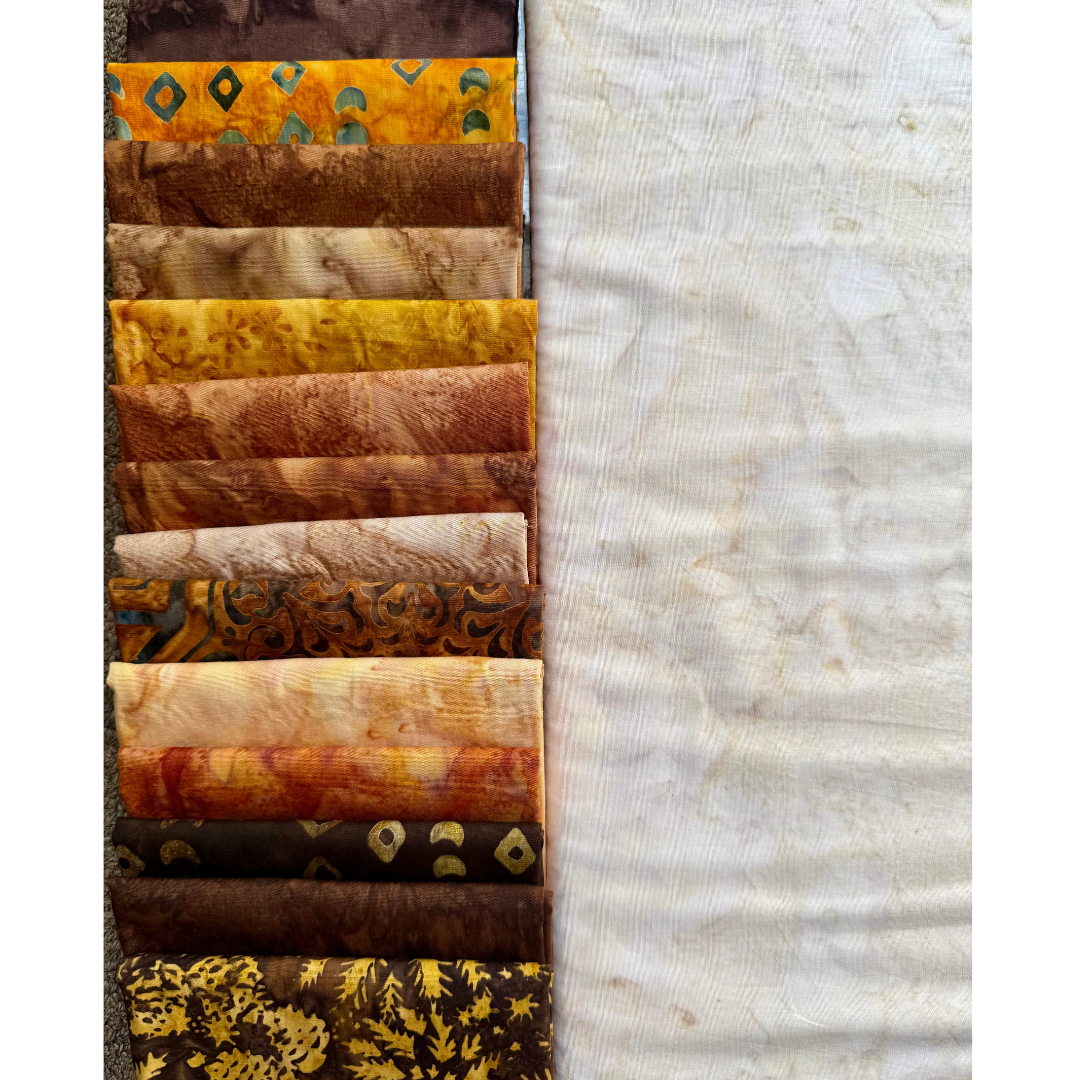Bring cozy, rustic charm to your Farmhouse Blues Quilt with this curated 14-piece fat quarter bundle in warm browns, tans, and earthy neutrals. Perfect for fall, these fabrics create a quilt that feels like home — like curling up by the fire with a quilt that’s stitched full of comfort.