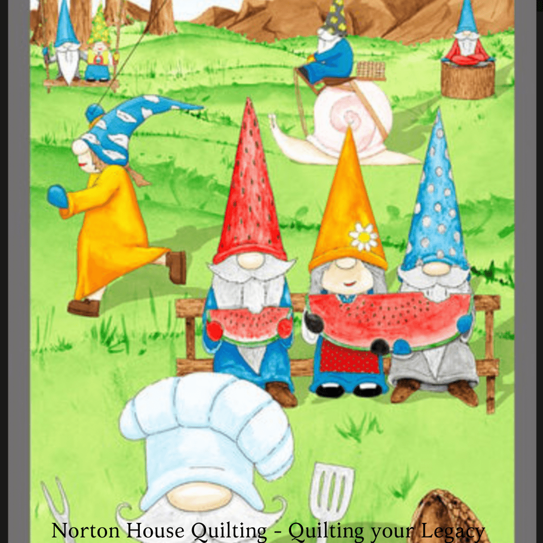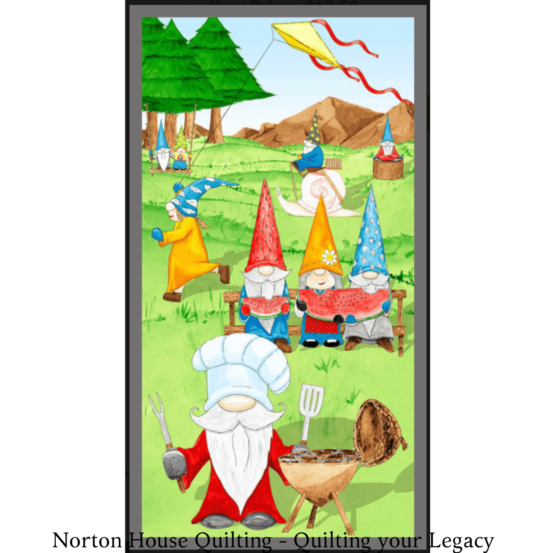 Hangin With My Gnomies 1447P 66 Green BBQ Panel Blank Quilting. Approx 24" x 44" panel.
